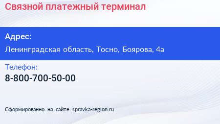 Связной, платежный терминал по адресу Ленинградская область, Тосно, Боярова, 4а в дальнейшем Организация, размещена в следующих категориях: