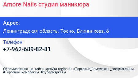 Amore Nails, студия маникюра по адресу Ленинградская область, Тосно, Блинникова, 6 в дальнейшем Организация, размещена в следующих категориях: