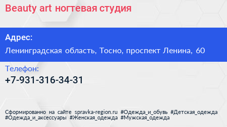 Beauty art, ногтевая студия по адресу Ленинградская область, Тосно, проспект Ленина, 60 в дальнейшем Организация, размещена в следующих категориях: