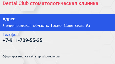 Dental Club, стоматологическая клиника по адресу Ленинградская область, Тосно, Советская, 9а в дальнейшем Организация, размещена в следующих категориях: