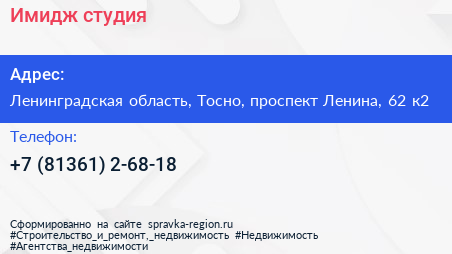 Имидж-студия по адресу Ленинградская область, Тосно, проспект Ленина, 62 к2 в дальнейшем Организация, размещена в следующих категориях:
