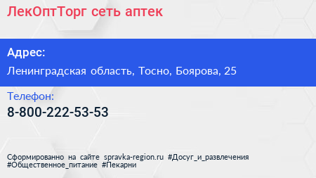 ЛекОптТорг, сеть аптек по адресу Ленинградская область, Тосно, Боярова, 25 в дальнейшем Организация, размещена в следующих категориях:
