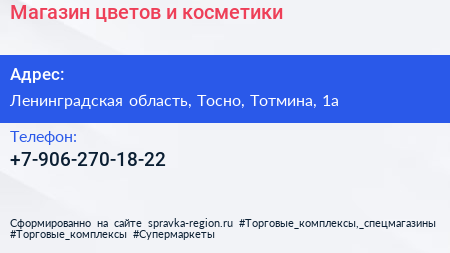 Магазин цветов и косметики по адресу Ленинградская область, Тосно, Тотмина, 1а в дальнейшем Организация, размещена в следующих категориях: