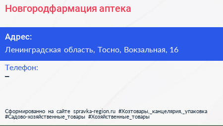 Новгородфармация, аптека по адресу Ленинградская область, Тосно, Вокзальная, 16 в дальнейшем Организация, размещена в следующих категориях: