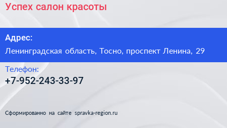 Успех, салон красоты по адресу Ленинградская область, Тосно, проспект Ленина, 29 в дальнейшем Организация, размещена в следующих категориях: