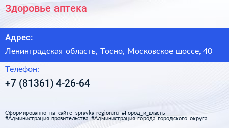 Здоровье, аптека по адресу Ленинградская область, Тосно, Московское шоссе, 40 в дальнейшем Организация, размещена в следующих категориях:
