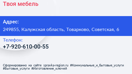 Твоя мебель по адресу 249855, Калужская область, Товарково, Советская, 6 в дальнейшем Организация, размещена в следующих категориях: