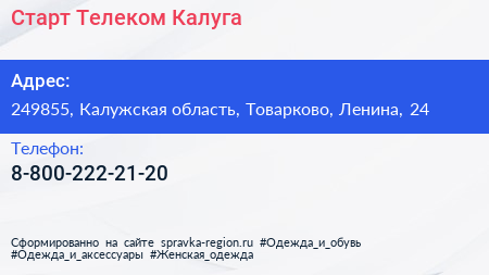 Старт Телеком Калуга по адресу 249855, Калужская область, Товарково, Ленина, 24 в дальнейшем Организация, размещена в следующих категориях: