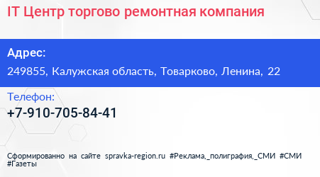 IT Центр, торгово-ремонтная компания по адресу 249855, Калужская область, Товарково, Ленина, 22 в дальнейшем Организация, размещена в следующих категориях:
