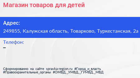 Магазин товаров для детей по адресу 249855, Калужская область, Товарково, Туркестанская, 2а в дальнейшем Организация, размещена в следующих категориях: