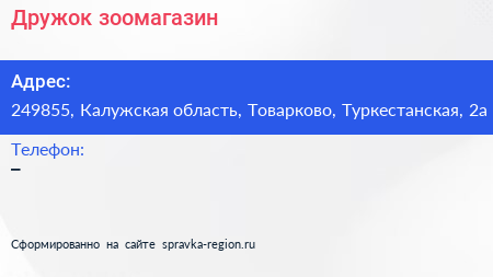 Дружок, зоомагазин по адресу 249855, Калужская область, Товарково, Туркестанская, 2а в дальнейшем Организация, размещена в следующих категориях: