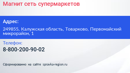 Магнит, сеть супермаркетов по адресу 249855, Калужская область, Товарково, Первомайский микрорайон, 1 в дальнейшем Организация, размещена в следующих категориях: