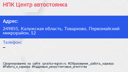 НПК-Центр, автостоянка по адресу 249855, Калужская область, Товарково, Первомайский микрорайон, 12 в дальнейшем Организация, размещена в следующих категориях: