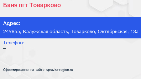 Баня, пгт. Товарково по адресу 249855, Калужская область, Товарково, Октябрьская, 13а в дальнейшем Организация, размещена в следующих категориях: