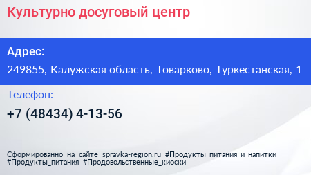 Культурно-досуговый центр по адресу 249855, Калужская область, Товарково, Туркестанская, 1 в дальнейшем Организация, размещена в следующих категориях: