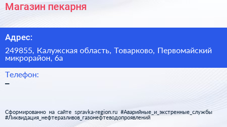 Магазин-пекарня по адресу 249855, Калужская область, Товарково, Первомайский микрорайон, 6а в дальнейшем Организация, размещена в следующих категориях: