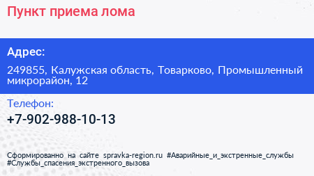 Пункт приема лома по адресу 249855, Калужская область, Товарково, Промышленный микрорайон, 12 в дальнейшем Организация, размещена в следующих категориях: