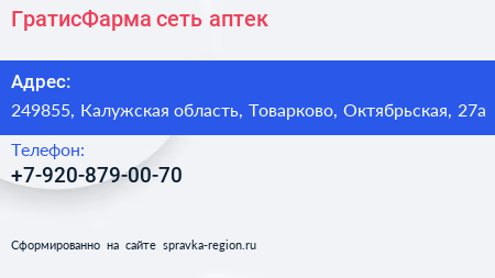 ГратисФарма, сеть аптек по адресу 249855, Калужская область, Товарково, Октябрьская, 27а в дальнейшем Организация, размещена в следующих категориях: