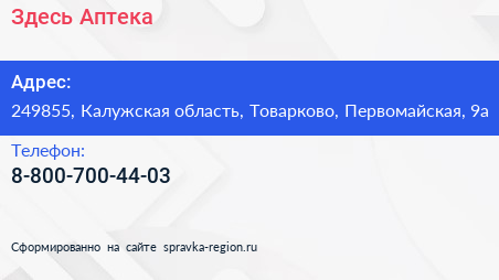 Здесь Аптека по адресу 249855, Калужская область, Товарково, Первомайская, 9а в дальнейшем Организация, размещена в следующих категориях: