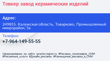 Товкер, завод керамических изделий по адресу 249855, Калужская область, Товарково, Промышленный микрорайон, 5а в дальнейшем Организация, размещена в следующих категориях: