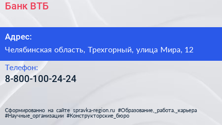 Банк ВТБ по адресу Челябинская область, Трехгорный, улица Мира, 12 в дальнейшем Организация, размещена в следующих категориях: