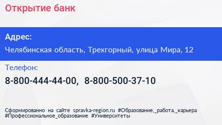 Открытие, банк по адресу Челябинская область, Трехгорный, улица Мира, 12 в дальнейшем Организация, размещена в следующих категориях: