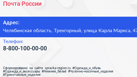 Почта России по адресу Челябинская область, Трехгорный, улица Карла Маркса, 47 в дальнейшем Организация, размещена в следующих категориях: