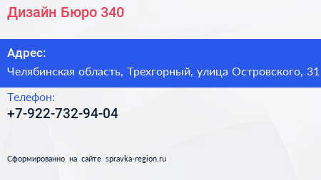Дизайн Бюро 340 по адресу Челябинская область, Трехгорный, улица Островского, 31 в дальнейшем Организация, размещена в следующих категориях: