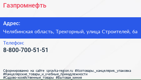 Газпромнефть по адресу Челябинская область, Трехгорный, улица Строителей, 6а в дальнейшем Организация, размещена в следующих категориях: