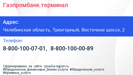 Газпромбанк, терминал по адресу Челябинская область, Трехгорный, Восточное шоссе, 2 в дальнейшем Организация, размещена в следующих категориях: