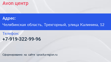 Avon, центр по адресу Челябинская область, Трехгорный, улица Калинина, 12 в дальнейшем Организация, размещена в следующих категориях: