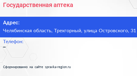 Государственная аптека по адресу Челябинская область, Трехгорный, улица Островского, 31 в дальнейшем Организация, размещена в следующих категориях: