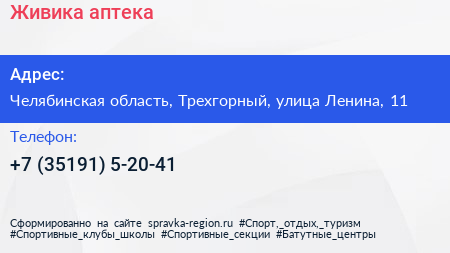 Живика, аптека по адресу Челябинская область, Трехгорный, улица Ленина, 11 в дальнейшем Организация, размещена в следующих категориях: