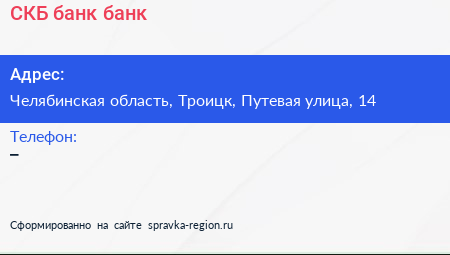 СКБ-банк, банк по адресу Челябинская область, Троицк, Путевая улица, 14 в дальнейшем Организация, размещена в следующих категориях: