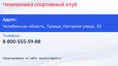 Чемпионика, спортивный клуб по адресу Челябинская область, Троицк, Нагорная улица, 10 в дальнейшем Организация, размещена в следующих категориях: