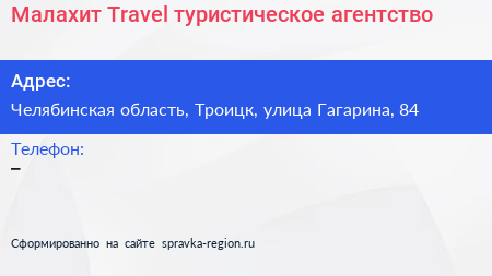 Малахит-Travel, туристическое агентство по адресу Челябинская область, Троицк, улица Гагарина, 84 в дальнейшем Организация, размещена в следующих категориях: