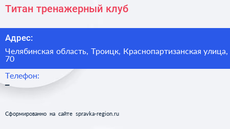 Титан, тренажерный клуб по адресу Челябинская область, Троицк, Краснопартизанская улица, 70 в дальнейшем Организация, размещена в следующих категориях:
