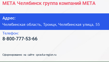 МЕТА-Челябинск, группа компаний МЕТА по адресу Челябинская область, Троицк, Челябинская улица, 55 в дальнейшем Организация, размещена в следующих категориях: