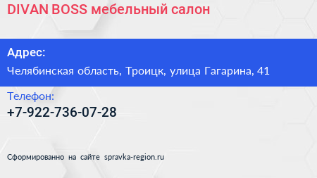DIVAN BOSS, мебельный салон по адресу Челябинская область, Троицк, улица Гагарина, 41 в дальнейшем Организация, размещена в следующих категориях: