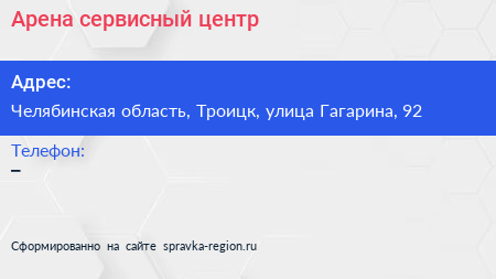 Арена, сервисный центр по адресу Челябинская область, Троицк, улица Гагарина, 92 в дальнейшем Организация, размещена в следующих категориях: