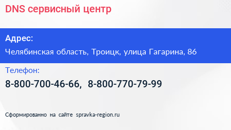 DNS, сервисный центр по адресу Челябинская область, Троицк, улица Гагарина, 86 в дальнейшем Организация, размещена в следующих категориях: