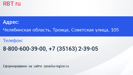 RBT.ru по адресу Челябинская область, Троицк, Советская улица, 105 в дальнейшем Организация, размещена в следующих категориях: