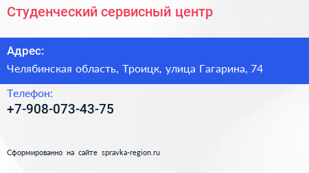 Студенческий, сервисный центр по адресу Челябинская область, Троицк, улица Гагарина, 74 в дальнейшем Организация, размещена в следующих категориях: