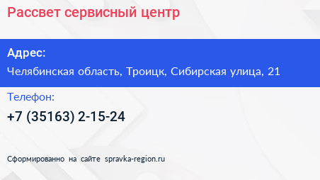 Рассвет, сервисный центр по адресу Челябинская область, Троицк, Сибирская улица, 21 в дальнейшем Организация, размещена в следующих категориях: