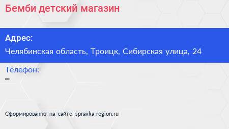 Бемби, детский магазин по адресу Челябинская область, Троицк, Сибирская улица, 24 в дальнейшем Организация, размещена в следующих категориях: