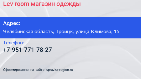 Lev room, магазин одежды по адресу Челябинская область, Троицк, улица Климова, 15 в дальнейшем Организация, размещена в следующих категориях: