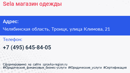 Sela, магазин одежды по адресу Челябинская область, Троицк, улица Климова, 21 в дальнейшем Организация, размещена в следующих категориях: