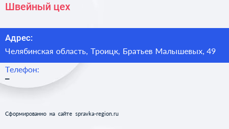 Швейный цех по адресу Челябинская область, Троицк, Братьев Малышевых, 49 в дальнейшем Организация, размещена в следующих категориях: