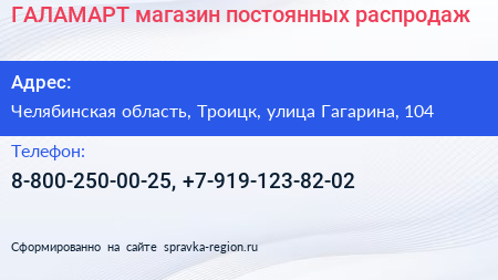 ГАЛАМАРТ, магазин постоянных распродаж по адресу Челябинская область, Троицк, улица Гагарина, 104 в дальнейшем Организация, размещена в следующих категориях: