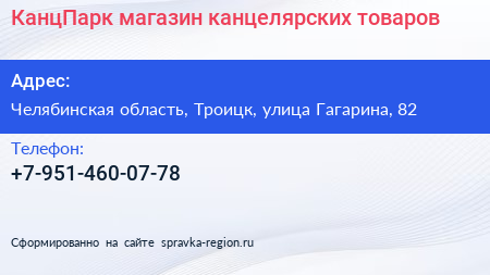 КанцПарк, магазин канцелярских товаров по адресу Челябинская область, Троицк, улица Гагарина, 82 в дальнейшем Организация, размещена в следующих категориях: